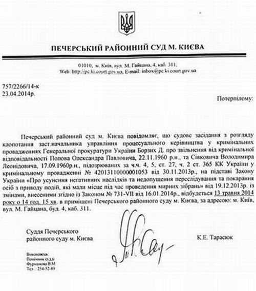 Засідання Печерського районного суду Києва з клопотанням Попова і Сівковича призначено на 14:15 вівторка, 13 травня, в кабінеті № 311.