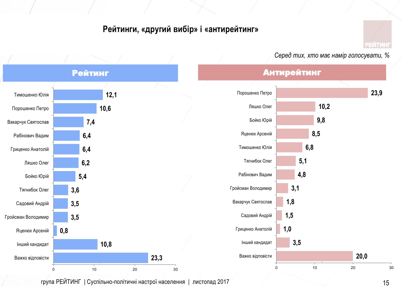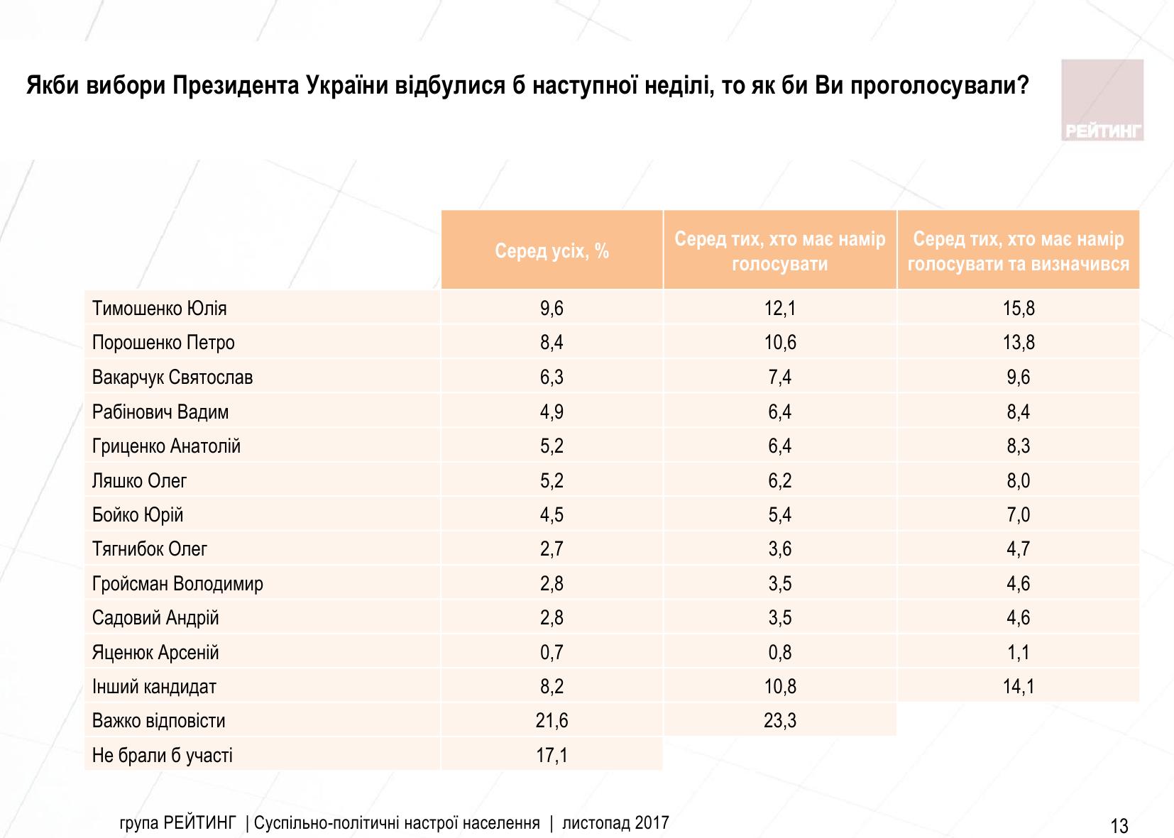 У листопаді 2017 року у президентському рейтингу лідирують Юлія Тимошенко, за яку готові віддати свої голоси 15,8% українців, і Петро Порошенко (13,8%), свідчать дані опитування Соціологічної групи "Рейтинг".