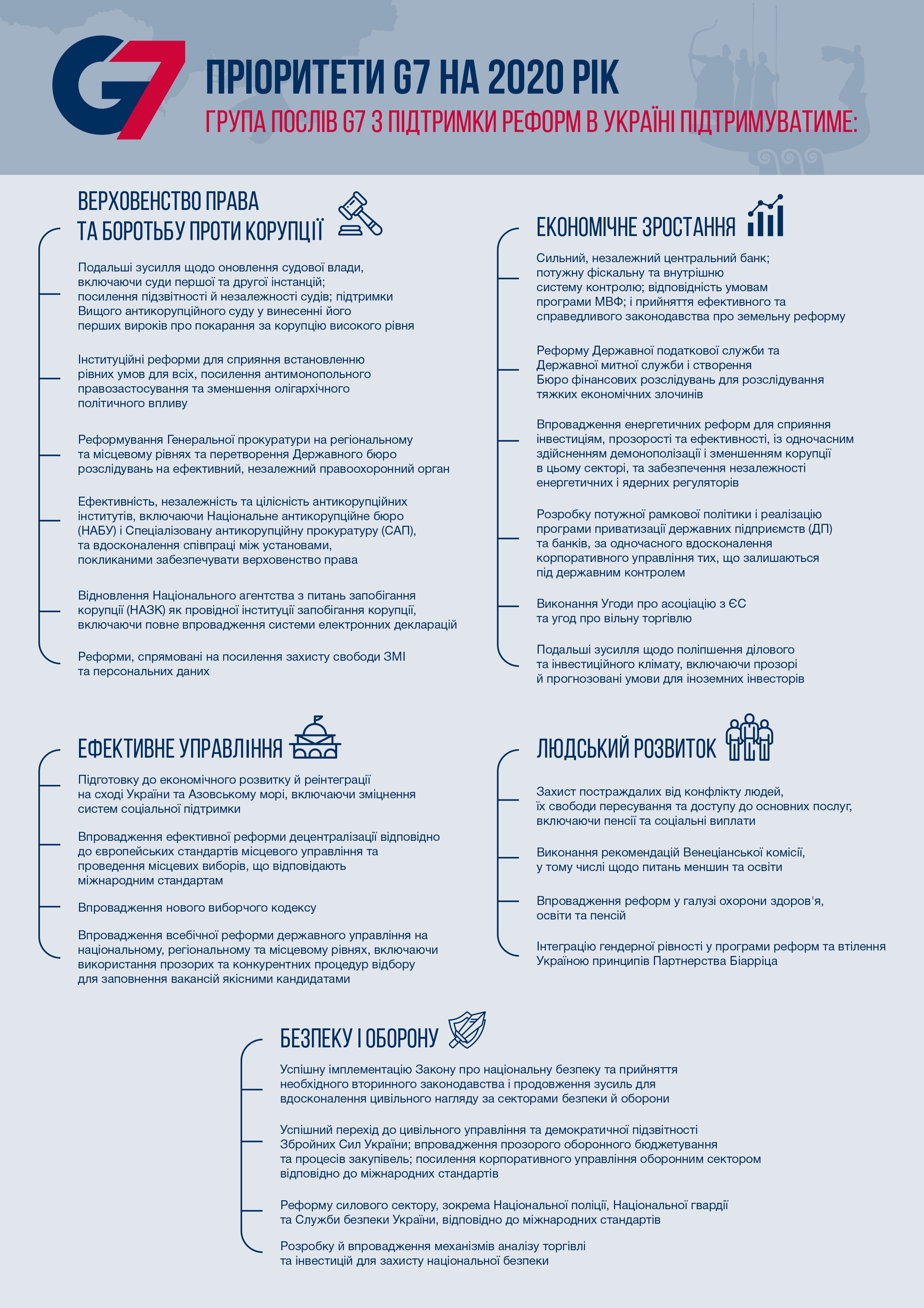 Розгорніть зображення нижче на весь екран, щоб ознайомитись з пріоритетами на 2020 рік групи послів країн G7 з підтримки реформ в Україні. pic.twitter.com/VqRlbxT1IF
