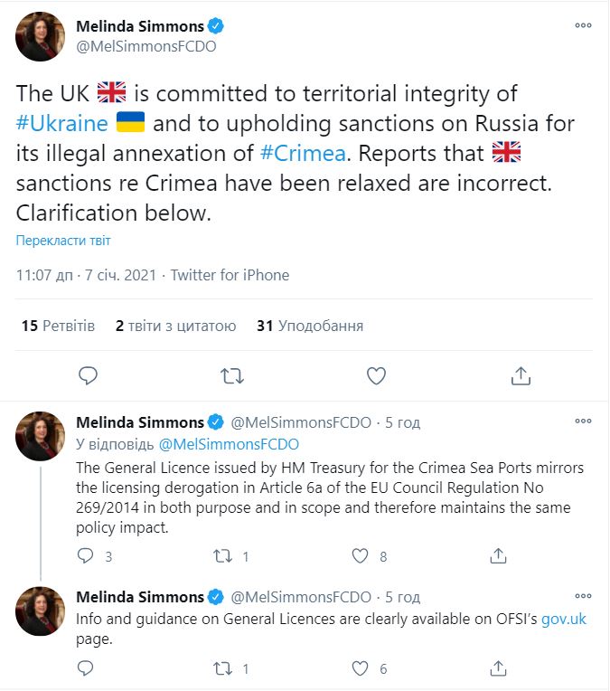 "Генеральна ліцензія, видана Казначейством Її Величності для морських портів Криму, відображає відступ від ліцензійних вимог, передбачене статтею 6a Постанови Ради ЄС № 269/2014, як по цілі, так і за обсягом, і тому зберігає такий же вплив на політику", - написала Сіммонс в Twitter.