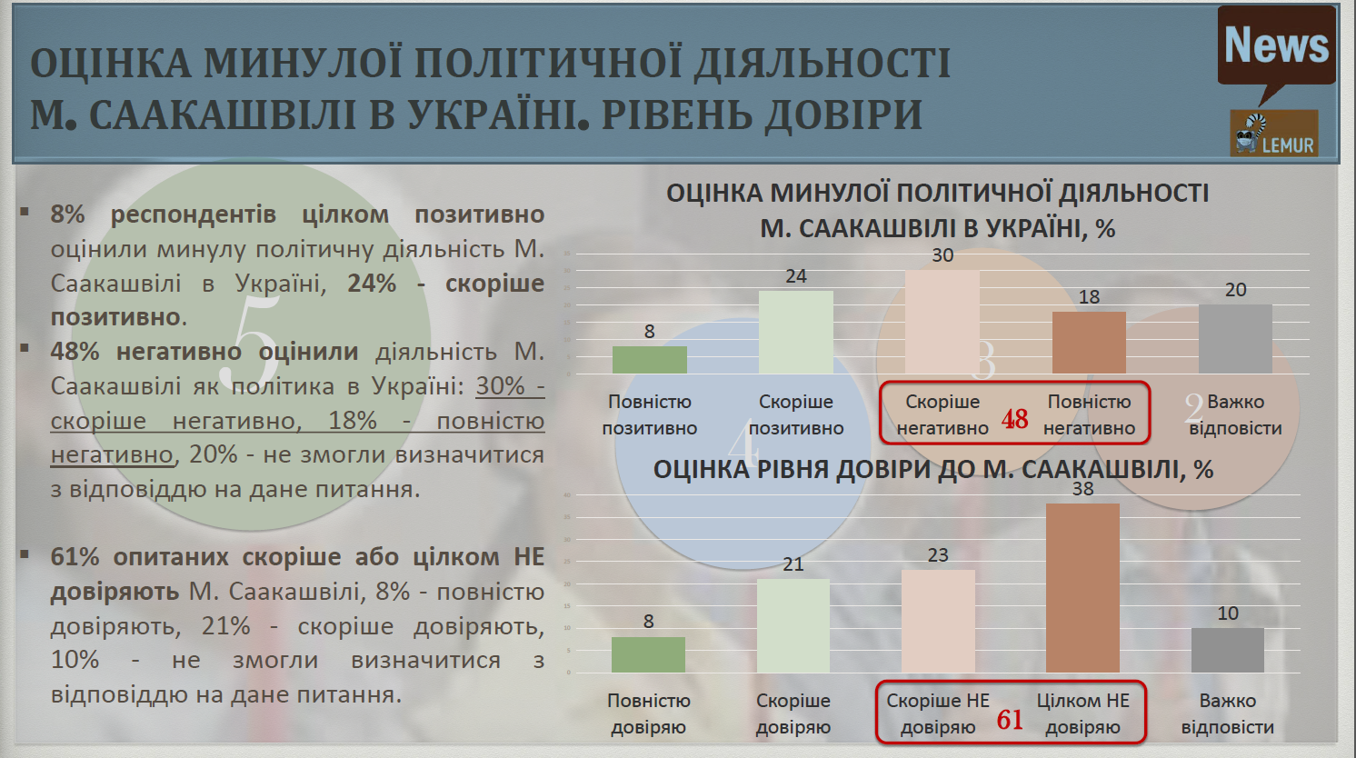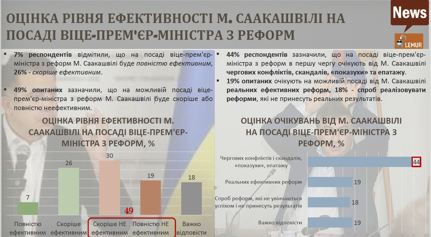 При цьому 61% не довіряє Міхеїлу Саакашвілі, а повністю довіряють 8% опитаних. Також 7% українців зазначили, що на посаді віцепрем'єра з реформ Саакашвілі буде повністю ефективним. Протилежної думки притримуються 49% громадян.
