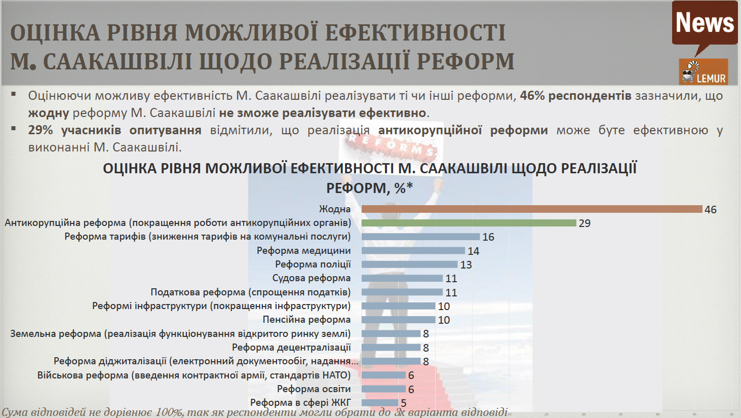 Водночас 46% опитаних зазначили, що жодну реформу Саакашвілі не зможе реалізувати ефективно. Ще 29% українців вважають, що реалізація антикорупційної реформи може бути ефективною у виконанні Саакашвілі.