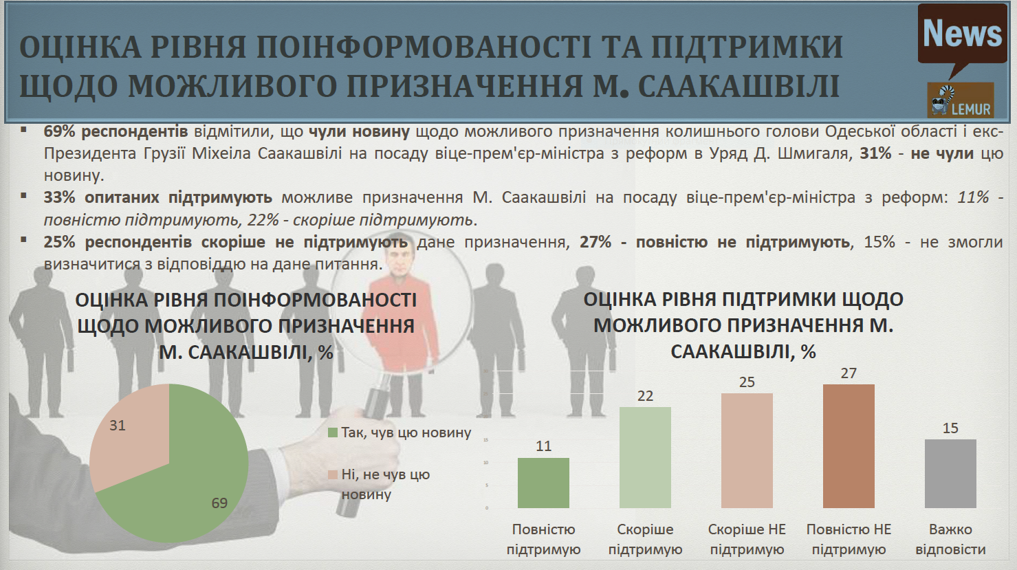 Про те, що експрезидента Грузії та колишнього очільника Одеської ОДА Міхеїла Саакашвілі можуть призначити віцепрем'єром з реформ чули 69% українців, йдеться у результатах дослідження New Image Marketing Group, проведеного на базі додатку "Лемур". Нічого про це не чули 31% респондентів. Підтримують призначення Саакашвілі на посаду віцепрем'єра 33% опитаних, протилежної думки притримуються – 25% громадян.