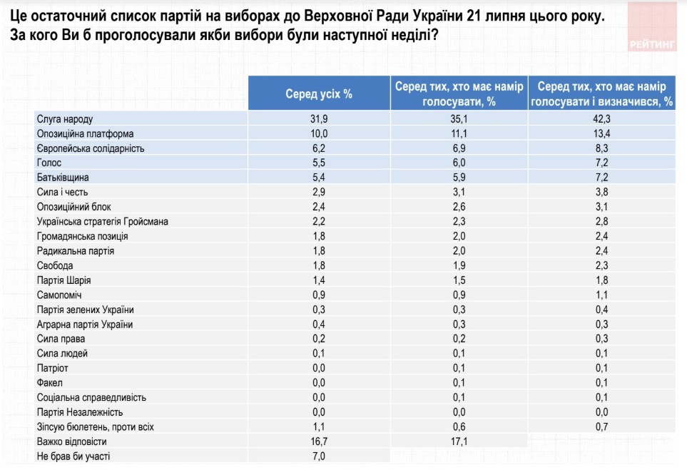 На парламентських виборах прохідний бар'єр у 5% можуть подолати п'ять політсил, згідно з результатами нового опитування Соціологічної групи "Рейтинг". Лідером залишається партія "Слуга народу" з підтримкою 42,3% серед тих, хто має намір голосувати і визначився з вибором.