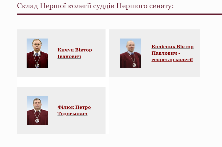 Слід зазначити, що до складу першої колегії Першого сенату входять троє суддів: Віктор Колісник (секретар колегії), Віктор Кичун та Петро Філюк. Двоє з них – Кичун і Колісник – раніше тривалий час працювали на одній кафедрі у Національному юридичному університеті ім. Ярослава Мудрого в Харкові разом із Федором Веніславським – членом парламентської фракції «Слуги народу» та представником президента Володимира Зеленського у Конституційному суді. Більше того, Кичуна експерти та політики відкрито називають креатурою Веніславського.