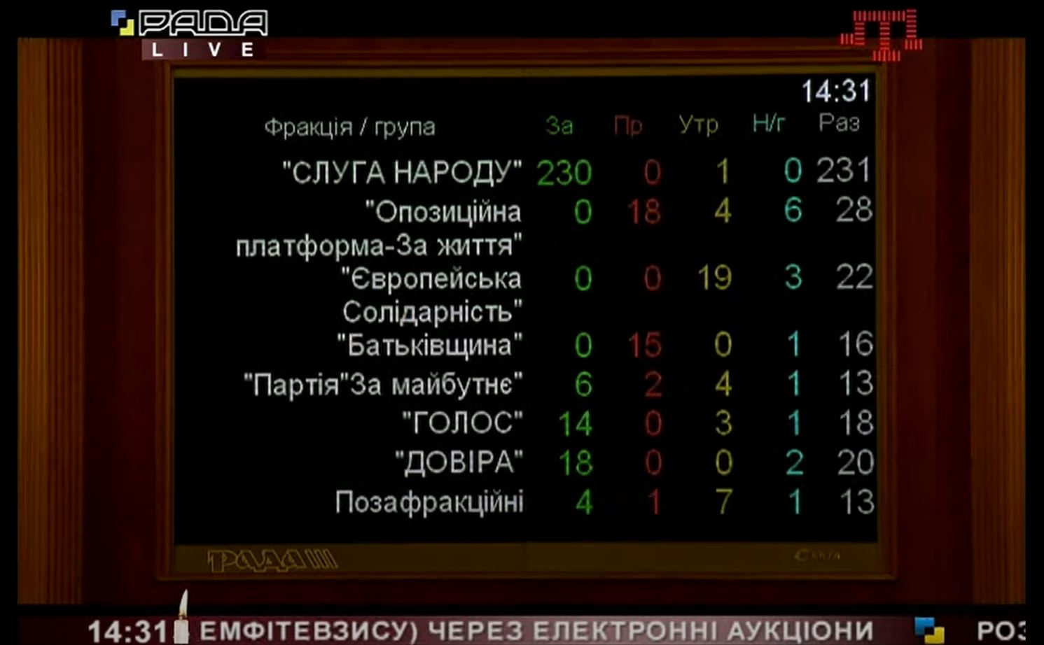 Верховна Рада ухвалила закон №2195 “Про внесення змін до деяких законодавчих актів щодо продажу земельних ділянок державної та комунальної власності або прав на них (оренди, суперфіцію, емфітевзису) через електронні аукціони”. Документ в цілому підтримали 272 народні депутати.