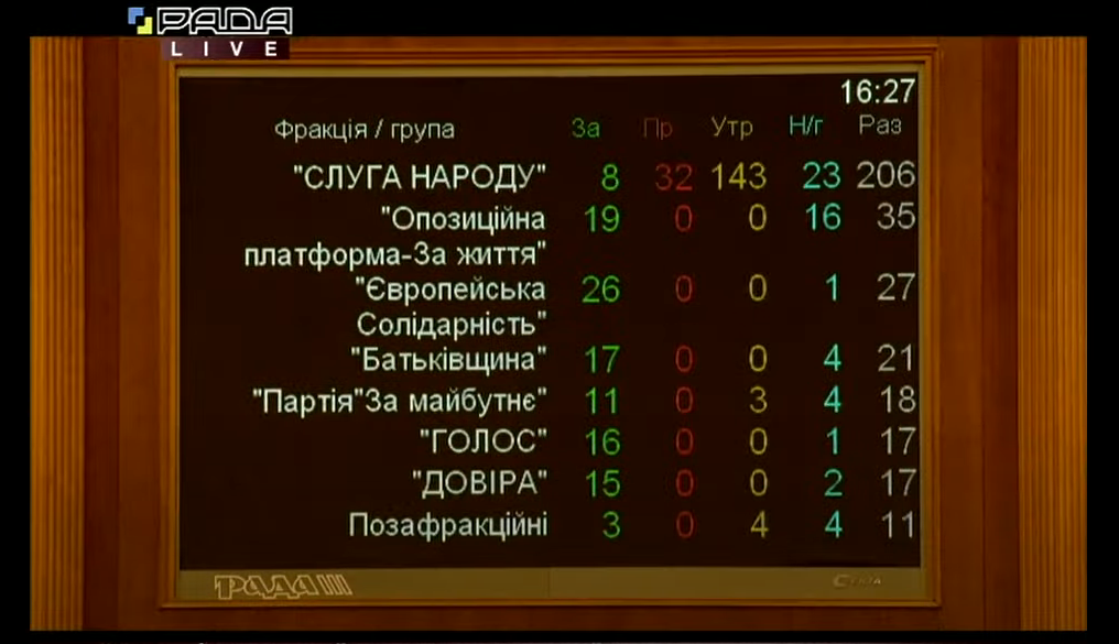 Ініційований опозицією проєкт постанови був поставлений на голосування на позачерговому засіданні парламенту 27 квітня і зібрав у залі 115 голосів з необхідних 226, владна «Слуга народу» утрималася майже в повному складі.