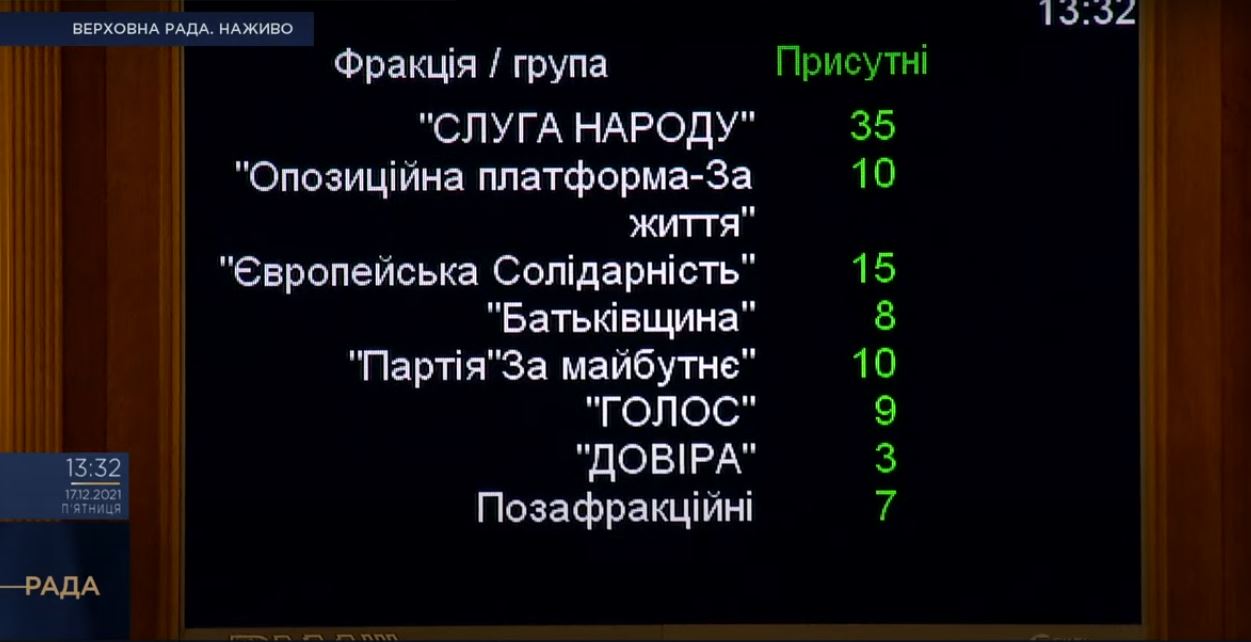 Народні депутати 17 грудня зібралися на позачергове засідання. У порядку денному був лише законопроєкт № 6376, який відтерміновує ще на рік впровадження касових апаратів. Однак, депутати навіть не змогли включити законопроєкт до порядку денного. Так, на момент відкриття позачергового засідання у залі зареєструвалися 97 народних депутатів.