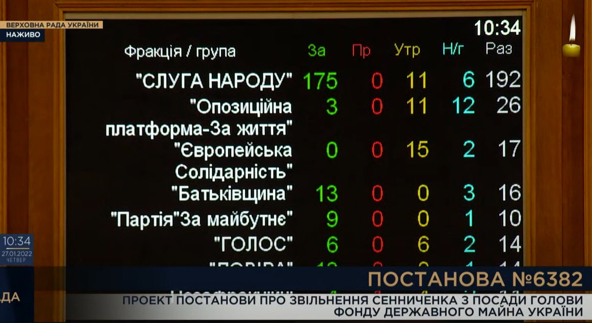 Верховна Рада не звільнила Дмитра Сенниченка з посади голови Фонду державного майна України. Його відставку підтримали 223 депутати при необхідних 226.