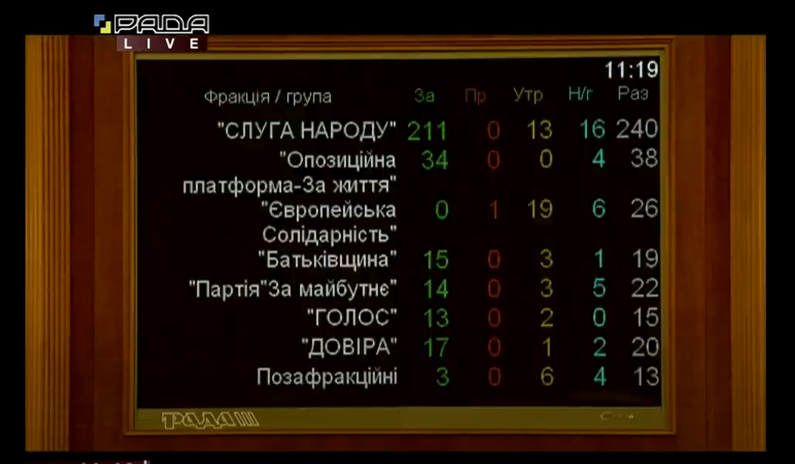 У свою чергу "Слуга народу" віддала 211 голосів "за", ОПЗЖ - 34, "Європейська солідарність" - 0, "Голос" - 13, "Батьківщина" - 15, "За майбутнє" - 14, "Довіра" - 17, позафракційні депутати - 3.