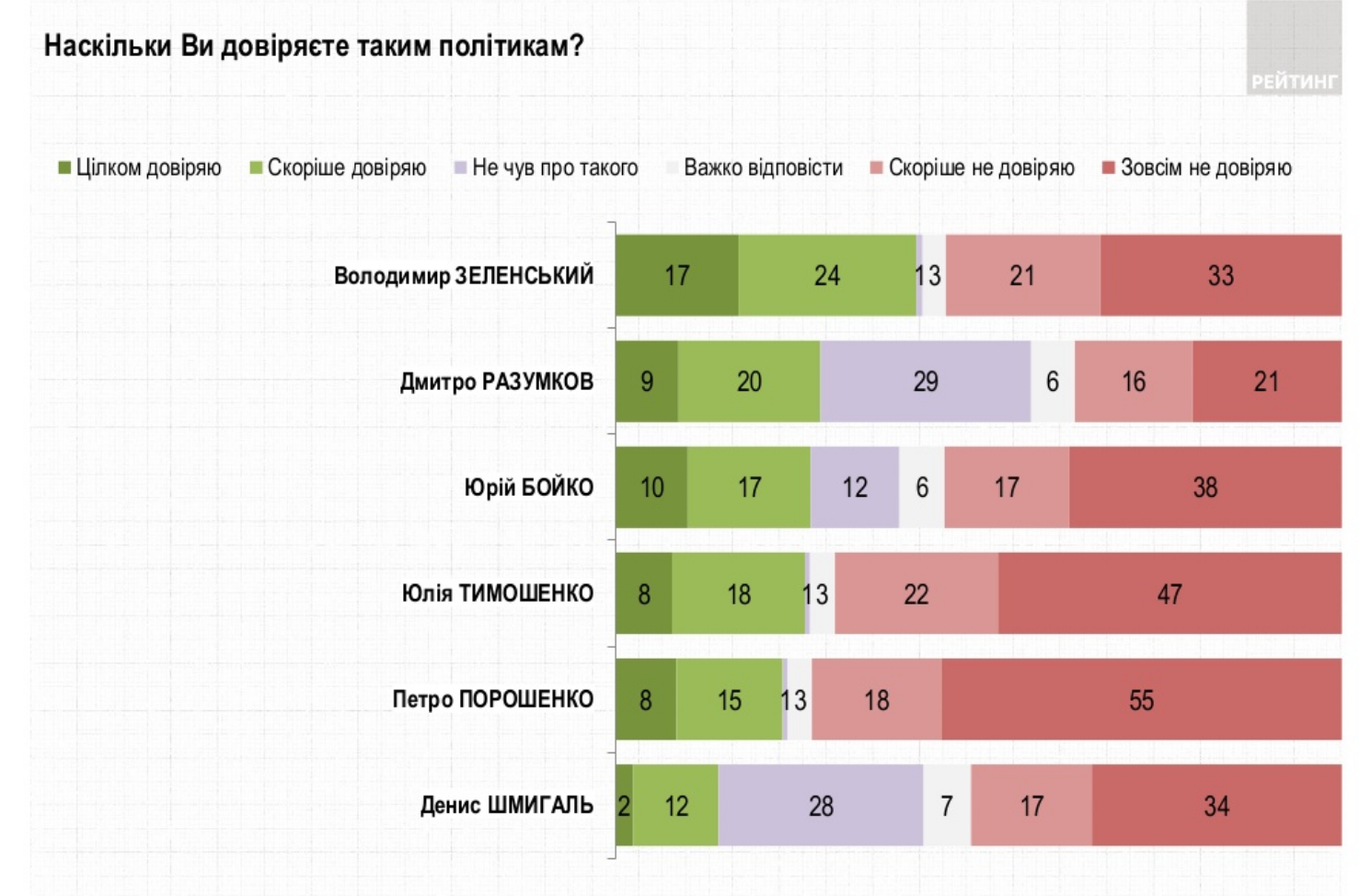 Найменшим рівнем довіри серед запропонованих респондентам користується прем’єр-міністр Денис Шмигаль. Йому довіряють 14%, більше чверті не знають його і, відповідно, більше половини – йому не довіряють.