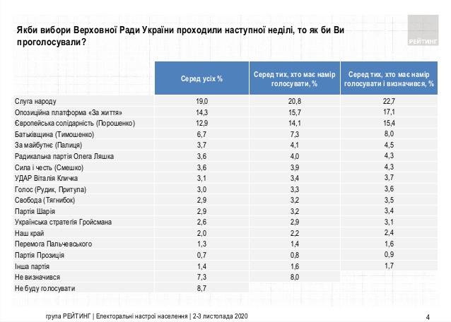 У парламентському рейтингу лідирує партія «Слуга народу», яку готові підтримати 22,7% тих, хто має намір голосувати і визначився з вибором. Про це свідчать результати опитування, проведеного Соціологічною групою «Рейтинг» 2-3 листопада.