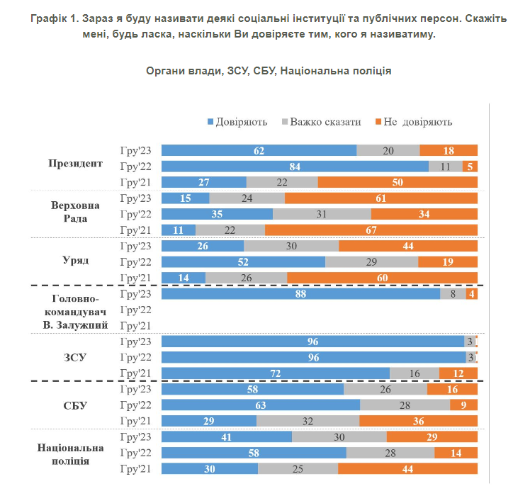 Соціологи зазначають, що торік президенту України не довіряли 5% українців, а цього року цей показник зріс до 18%. Відповідно, якщо баланс довіри-недовіри у грудні 2022 року для Президента становив +80%, то зараз він становить +42%.