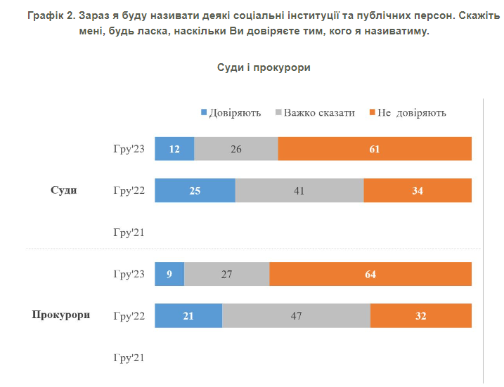 Критично низькою тепер серед українців є довіра судам і прокурорам. Лише 12% українців довіряють судам і лише 9% довіряють прокурорам. Не довіряють – відповідно, 61% і 64%. У грудні 2022 року судам довіряли 25%, прокурорам – 21%, при цьому було вдвічі менше тих, хто не довіряв їм.
