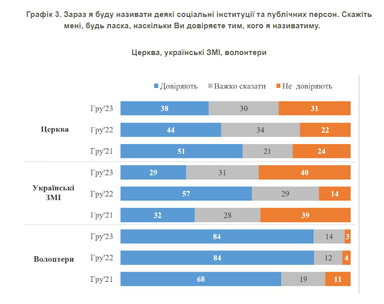 Стабільно втрачає довіру громадськості церква. Між груднем 2021 і груднем 2022 року довіра Церкві знизилася з 51% до 44%, між груднем 2022 року і груднем 2023 року – з 44% до 38%.