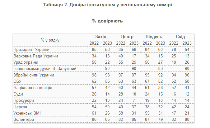 При цьому критичне ставлення до влади зросло у всіх регіонах. Абсолютна більшість громадян України довіряють ЗСУ, В. Залужному та волонтерам.