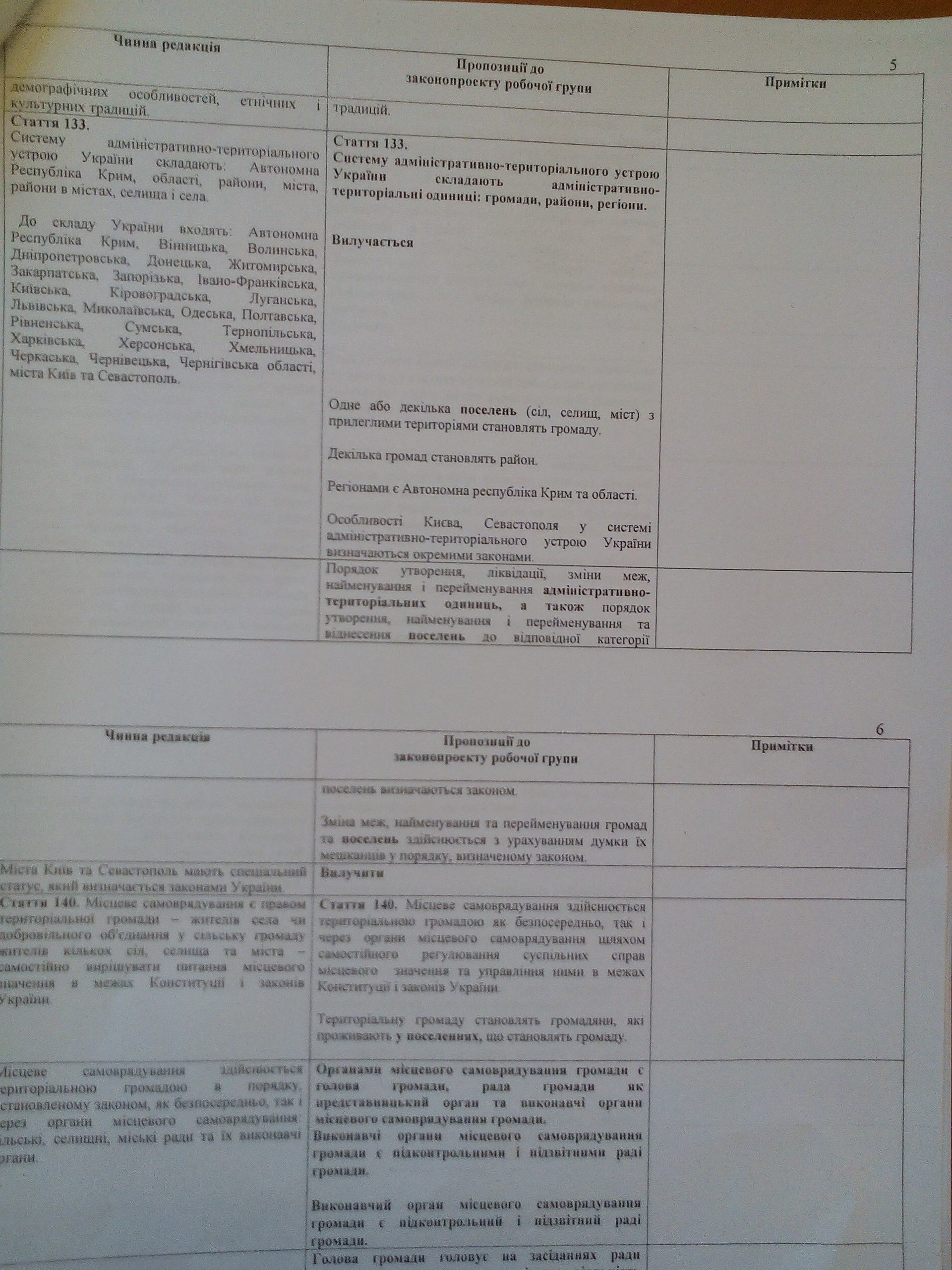 Робоча група запропонувала внести зміни до статті 133 Конституції України, згідно з якими систему адміністративно-територіального устрою україни складають адміністративно-територіальні одиниці: громади, райони, регіони замість областей, районів, міст, селищ і сіл, передбачених чинною редакцією Конституції України.