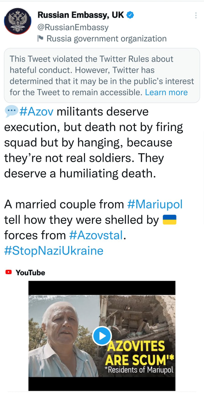 "Бойовики "Азова" заслуговують розстрілу, але смерті не через розстріл, а через повішення, бо вони не справжні солдати. Вони заслуговують на принизливу смерть", - йдеться в повідомленні офіційного посольства Росії у Британії.