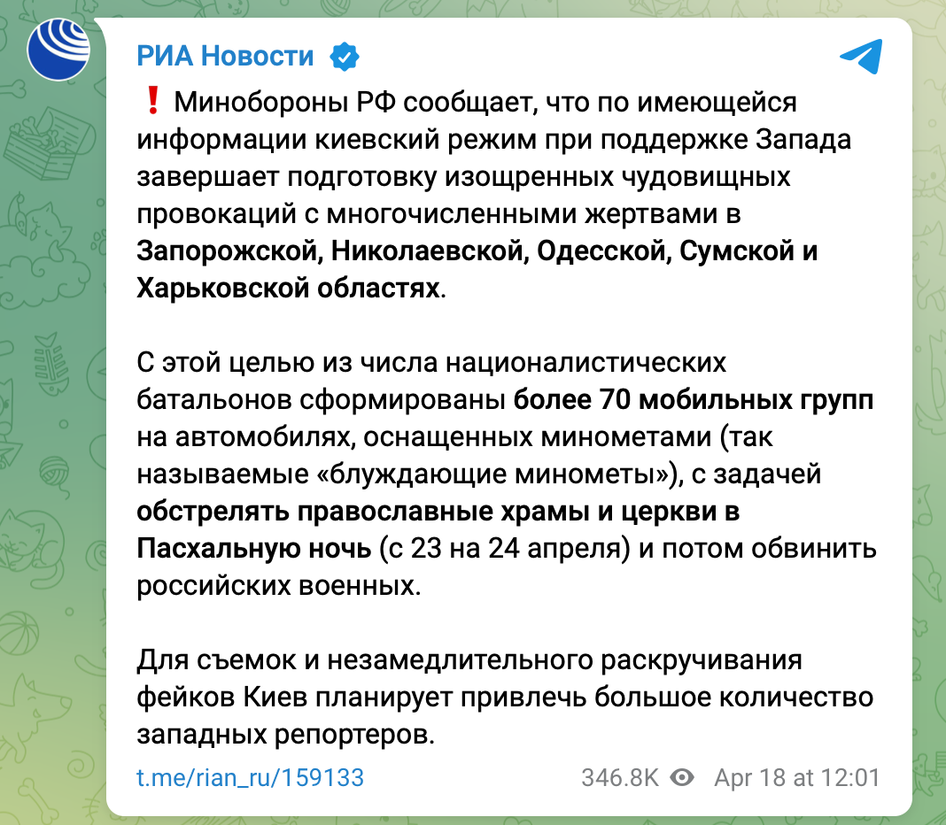 "З цією метою серед націоналістичних батальйонів сформовано понад 70 мобільних груп на автомобілях, оснащених мінометами (так звані "блукаючі міномети"), із завданням обстріляти православні храми та церкви у Великодню ніч (з 23 на 24 квітня) і потім звинуватити російських військових", — цитує агентство заяву відомства.