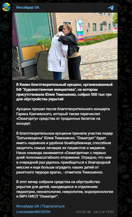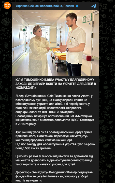 “Инсайдер UA” та “Украина Сейчас: новости, война, Россия” публікували дописи, що Тимошенко взяла участь у благодійному заході від благодійного фонду “Мистецька ініціатива”.