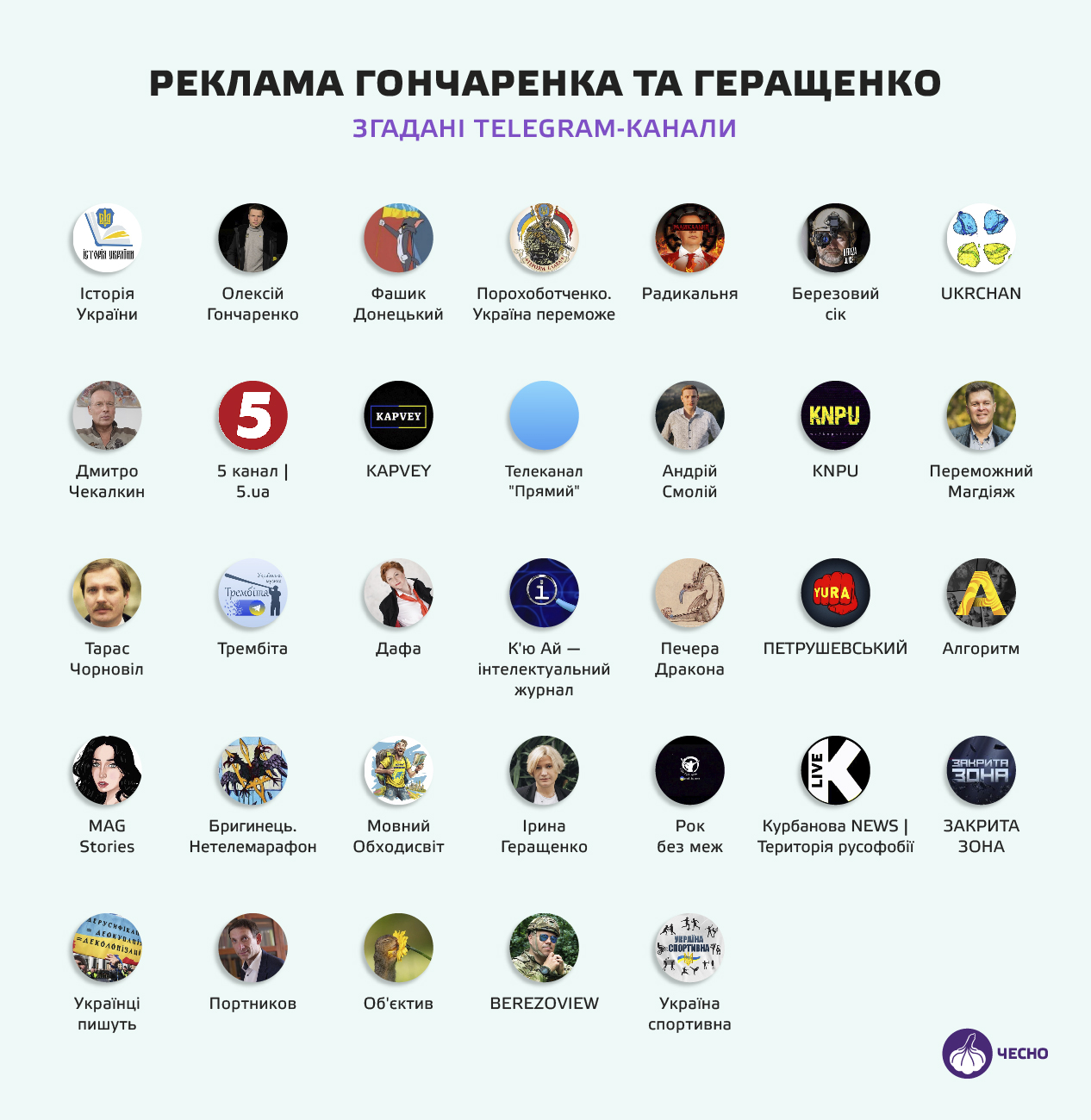 Аналітики Руху ЧЕСНО також зафіксували серію дописів із закликом підписуватись на канали, в тому числі представників партії "ЄС" Ірини Геращенко та Олексія Гончаренка. Дописи про них охопили 34 різні канали, що часто симпатизують “ЄС”.