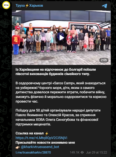 Такі Telegram-канали як: “Труха”, “Харьков 1654”, “Харьков Life | Харків” розміщували “джинсу” про благодійну діяльність двох депутатів від партії “Слуга народу” — Олексія Красова та Павла Якименка.