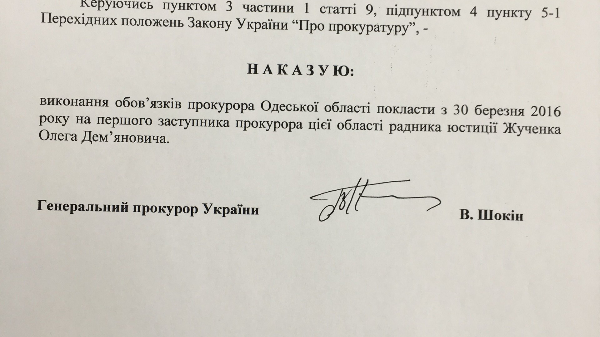 "Виконання обов'язків прокурора Одеської області покладено на першого заступника прокурора цієї області Жученка О. Д.", - підсумували в ГПУ.