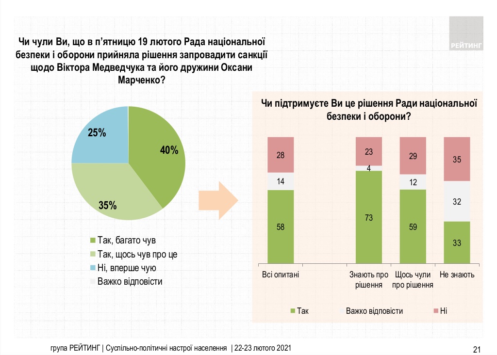 Про рішення РНБО щодо введення санкцій проти проросійського політика Віктора Медведчука та його дружини Оксани Марченко добре знають 40% українців, йдеться в опитуванні Соціологічної групи “Рейтинг”. Ще 35% громадян щось чули про це, а 25% – вперше чують.