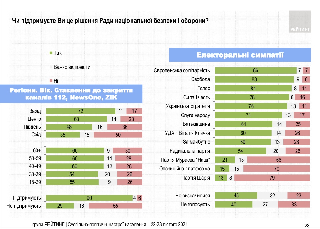 Водночас підтримують таке рішення 58% опитаних, а протилежної думки притримуються 28% громадян. Серед тих, хто добре знає про це рішення, 73% зазначили про його підтримку, 23% – висловилися проти санкцій.