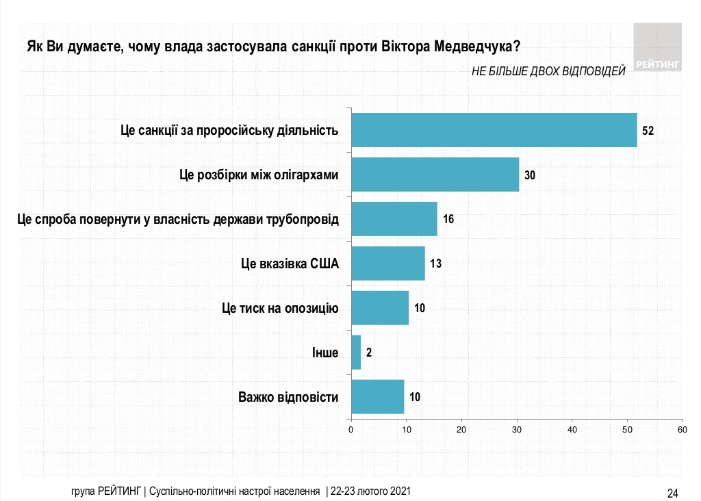 Крім того, 52% вважають, що санкції викликані проросійською діяльністю Медведчука. Ще 30% переконані, що причиною стали розбірки між олігархами. Також 16% респондентів вважають, що таке рішення – це спроба повернути у власність держави трубопровід. Вказівкою з боку США санкції називають 13% українців, а 10% говорять про тиск на опозицію.