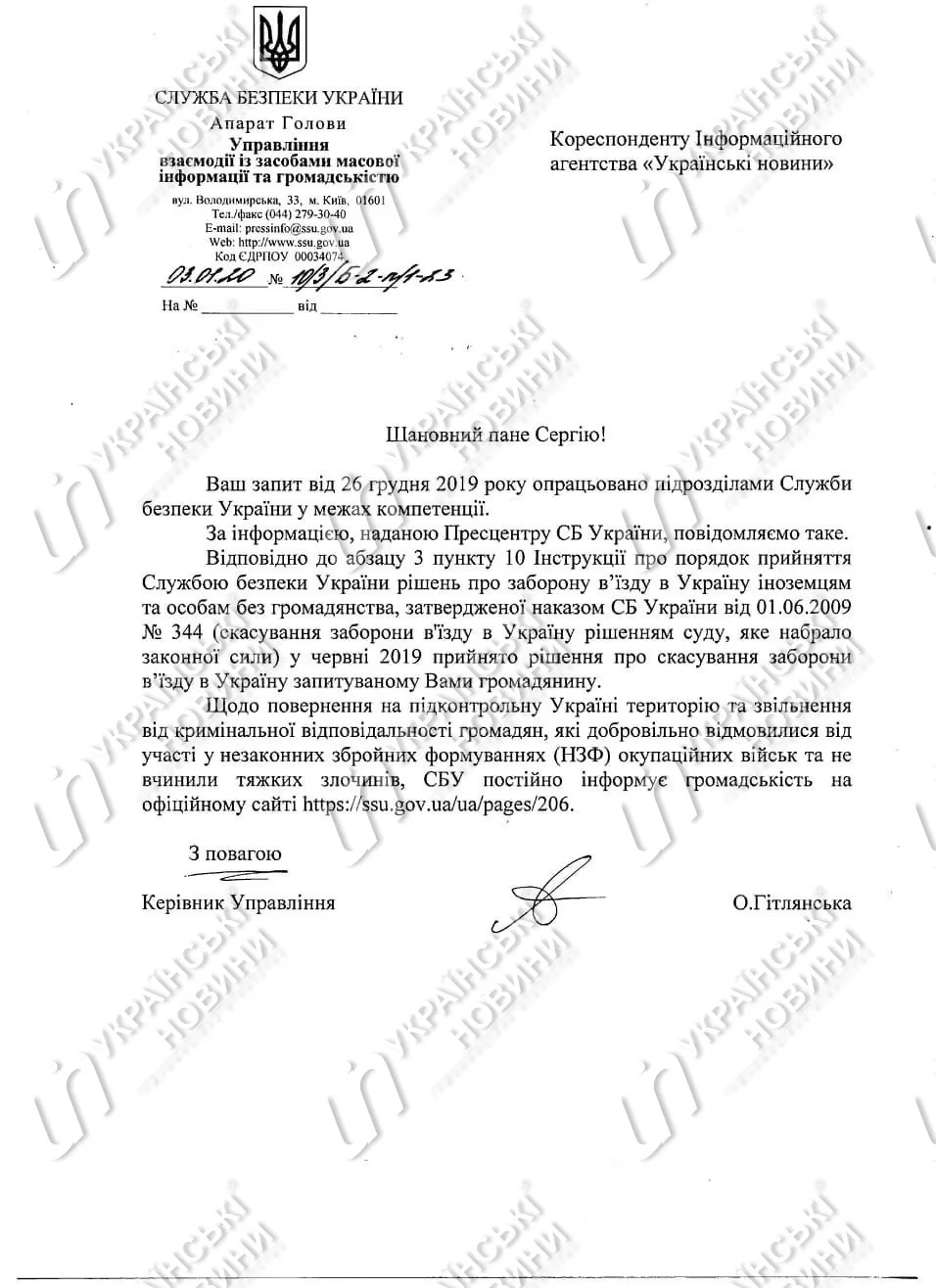 Трирічну заборону, виписану в 2017 році, скасували в червні 2019 року згідно з рішенням суду, який визнав заборону незаконною. Про це йдеться у відповіді СБУ на запит інформагентства "Українські новини". Фотокопію документа опубліковано на сайті видання.