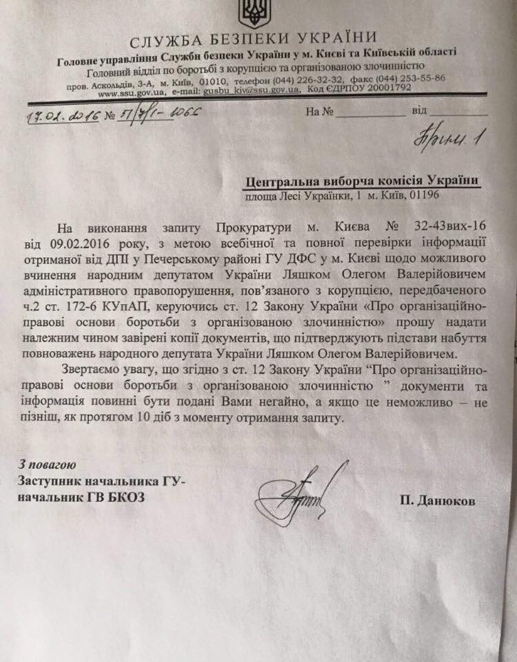 Згідно з текстом документа, перевірка проводиться за інформацією від Печерської податкової інспекції про можливе вчинення Ляшко адміністративного правопорушення, пов'язаного з корупцією. Зокрема, силовики звернулися до Центрвиборчкому за інформацією про підстави набуття повноважень народного депутата Ляшка.