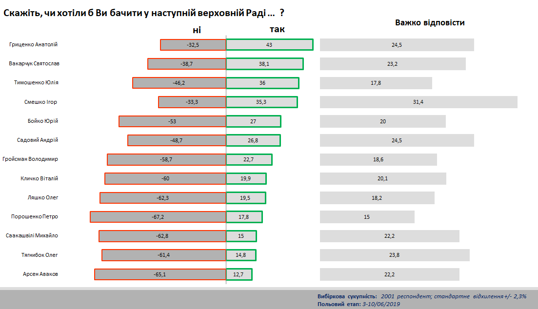 Серед політиків, яких хотіли б бачити у складі нової Верховної Ради перші місця посідають Анатолій Гриценко (43%), Святослав Вакарчук (38,1%) та Юлія Тимошенко (36%).