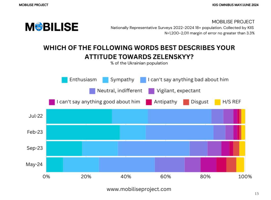 "Крім цього, респондентів просили відповісти, яке з восьми слів / словосполучень краще описує ставлення до президента. Хоча дійсно є тенденція до зниження частки тих, хто ставиться до глави держави із захопленням (з 33% у липні 2022 року до 8% зараз), але загалом більшість українців (69%) мають нейтрально-позитивне ставлення (із більш вираженою нейтральністю, стриманістю)", - зазначили соціологи.