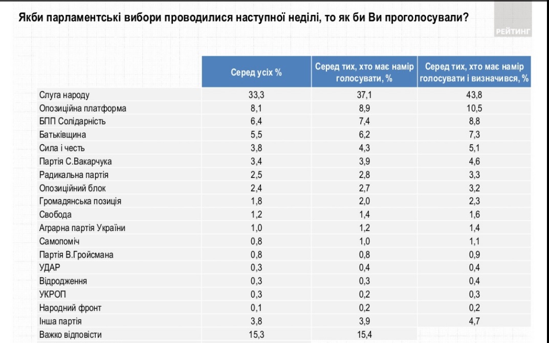 На другому місці у виборі тих, хто вже визначився, опинилась "Опозиційна платформа – За життя" – за неї голоси готові віддати 10,5%, за БПП "Солідарність" планують проголосувати 8,8%, за партію "Батьківщина" – 7,3%, партію "Сила та честь" Ігоря Смешка – 5,1%, партію Святослава Вакарчука "Голос" планують підтримати – 4,6%, "Радикальну партію" Олега Ляшка – 3,3%, "Опозиційний блок" – 3,2%. Рейтинг інших партій менший 3%. Таким чином до парламенту може потрапити вісім політичних партій, якщо прохідний бар'єр таки буде зменшено до 3%, і п'ять, якщо виборче законодавство залишиться таким же, як є сьогодні, тобто прохідний поріг буде 5%.