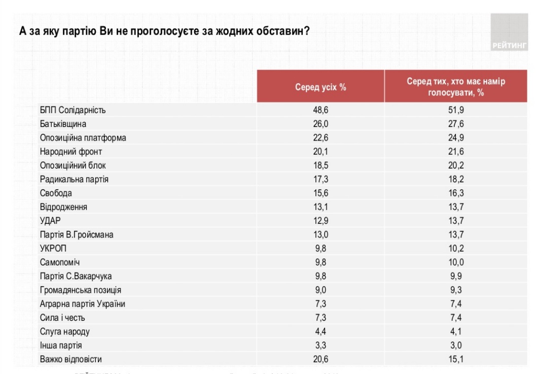 Водночас антирейтинг партій очолює БПП "Солідарність". За неї за жодних обставин не проголосували б 51,9%.