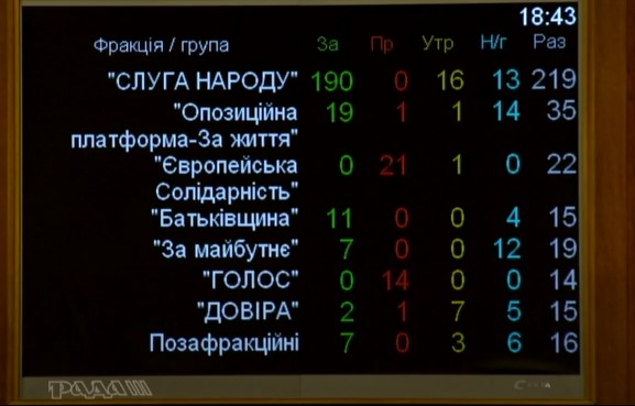 За внесення змін до закону "Про запобігання корупції" проголосували 244 народних депутати – члени фракцій "Слуги народу" (190 депутатів), "Батьківщини" (11), "Опозиційної платформи – За життя" (20) і груп "Довіра" (6) і "За майбутнє" (8). Проєкт також підтримали 9 позафракційних депутатів, включаючи спікера Дмитра Разумкова і віце-спікерів Руслана Стефанчука й Олену Кондратюк.