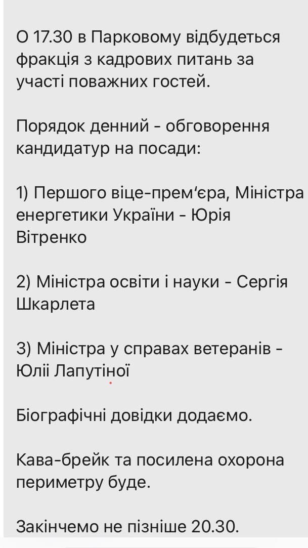 "Слуга народу" 15 грудня збереться на засідання фракції для обговорення кадрових питань, повідомили джерела ZN.UA в СН. Зокрема, народні депутати обговорять призначення міністра з питань ветеранів, голови Міносвіти та міністра енергетики.