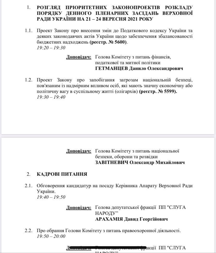 За його словами, Арахамія не має права розглядати питання про призначення голови апарату, згідно зі статтею 8 закону про регламент ВР, пропонувати призначення може виключно одна людина - голова верховної Ради. Тому, щоб продавити голосування по закону про олігархів на цьому тижні, Банковій необхідно призначити в.о. голови парламенту - заступника голови Руслана Стефанчука, "а оптимально - прибрати Разумкова з поста взагалі", - зазначає Бутусов.