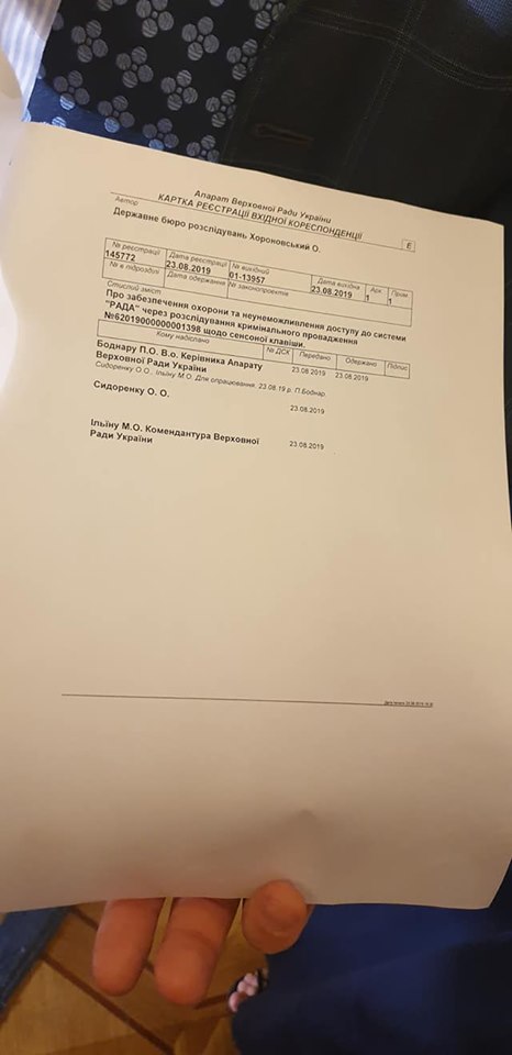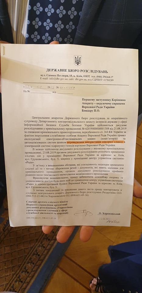 Своєю чергою журналістка телеканалу СТБ Альона Лунькова наголошує на тому, що слідчі мають при собі лист-попередження, адресований керуючому справами ВР Петру Боднару. "У Верховній Раді проводять слідчі дії ДБР і СБУ. Мають якийсь лист-попередження, що запровадження сенсорної кнопки - є злочин. Заблоковано комп'ютерний центр управління системою РАДА-3", - пише вона у Facebook.