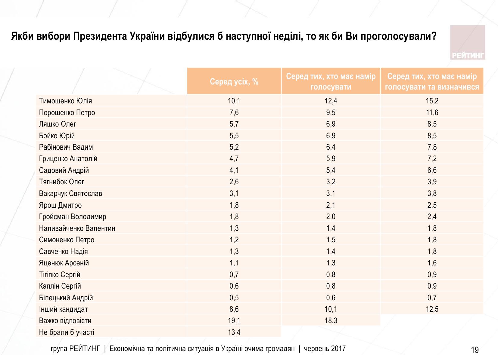 Серед тих, хто має намір взяти участь у виборах і визначився з уподобаннями, 8,5% проголосують за Олега Ляшка, 8,5% - за Юрія Бойка, 7,8% - за Вадима Рабиновича, 7,2% - за Анатолія Гриценка, 6,6% - за Андрія Садового - 6,6%, 3,9% - за Олега Тягнибока, 3,8% - за Святослава Вакарчука, 2,5% - за Дмитра Яроша - 2,5%, 2,4% - за Володимира Гройсмана. Рейтинг інших кандидатів менше 2%.