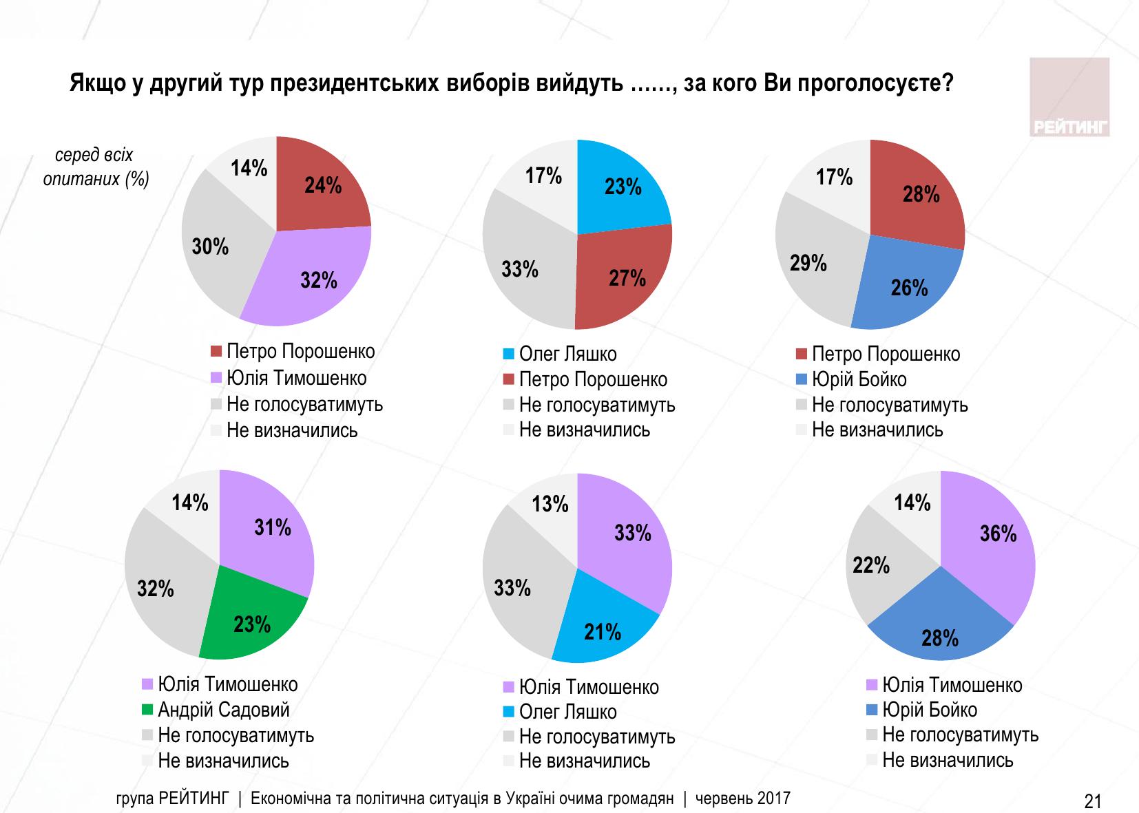 Соціологи провели моделювання другого туру виборів, включивши в нього Тимошенко, Порошенка, Ляшка, Бойка, Рабиновича і Садового.