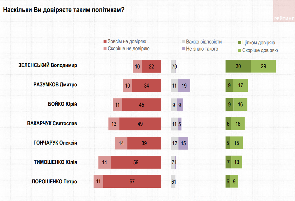 Діяльність співголови "Опозиційної платформи-За життя" Юрія Бойка підтримують 25% опитаних, не підтримують – 56%. Лідеру "Голосу" Святославу Вакарчуку довіряють 22% українців, не довіряють 62%. Лідерка "Батьківщини" Юлія Тимошенко користується підтримкою 20% опитаних та не користується – 73%. Голові "Європейської солідарності" Петру Порошенку довіряють 15% опитаних, не довіряють – 78%.