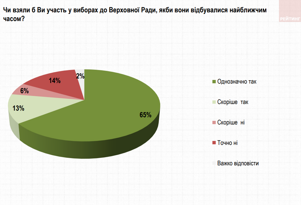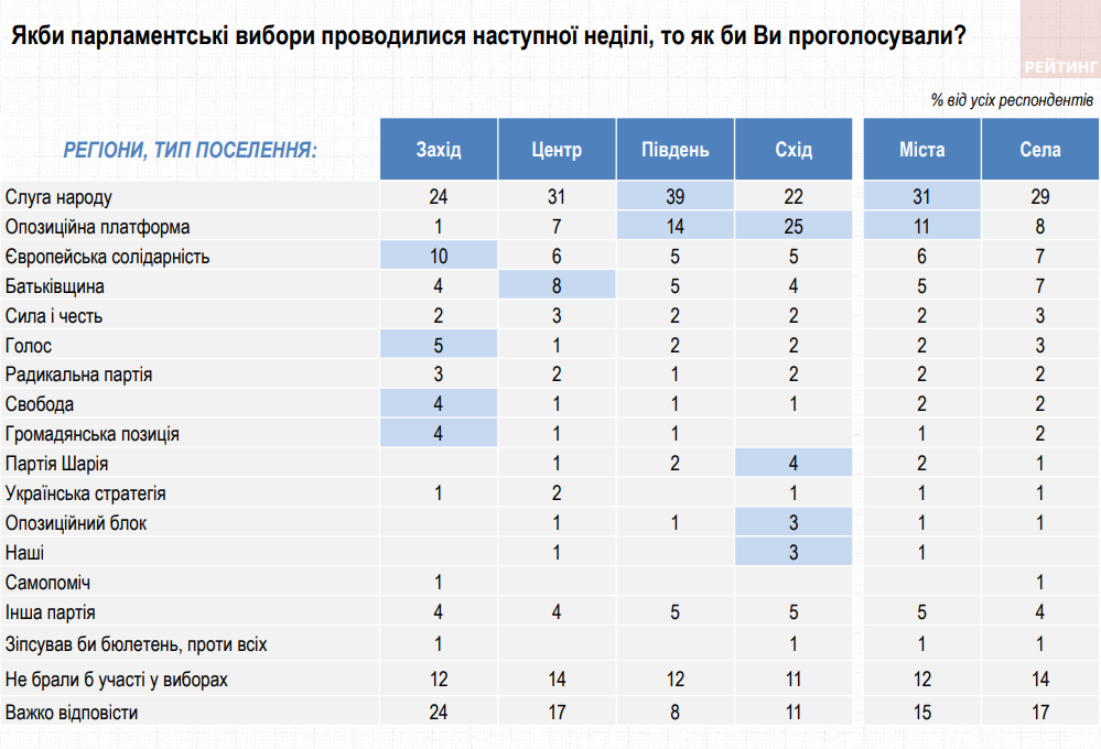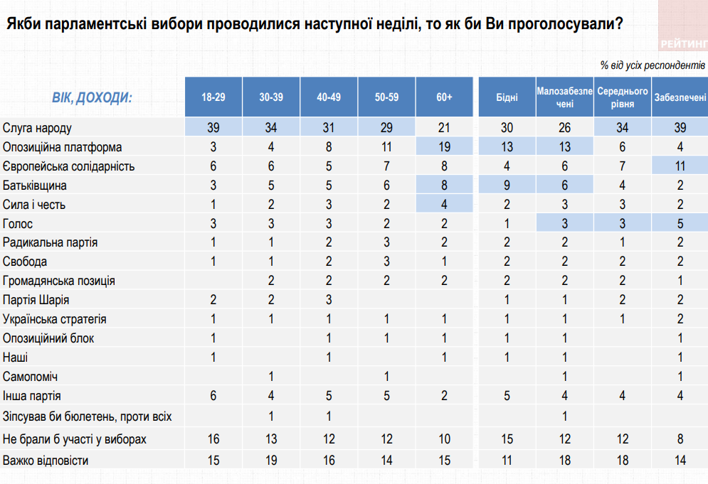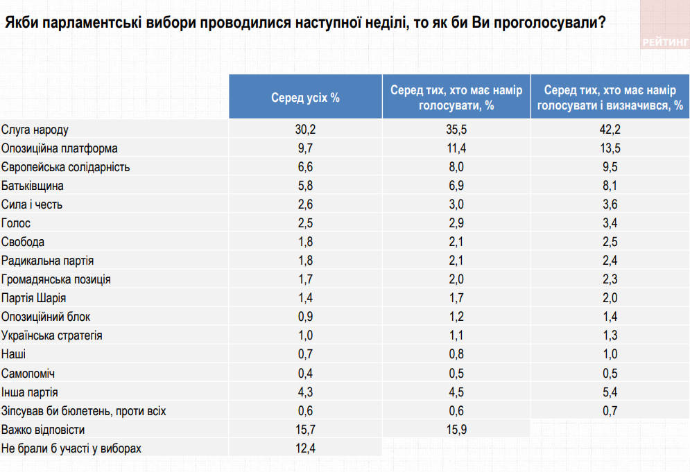 Рейтинг політичних сил очолює партія "Слуга народу": 42,2% серед тих, хто визначився та має намір голосувати. Підтримати "ОПЗЖ" готові 13,5% опитаних, "Європейську солідарність" – 9,5%, "Батьківщину" – 8,1%. Підтримка інших партій – нижче 4%. Ще 16% опитаних українців поки не визначилися зі своїми політичними симпатіями.