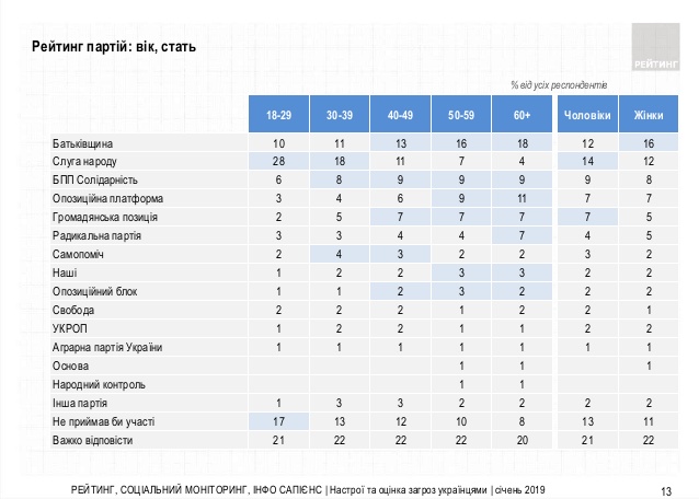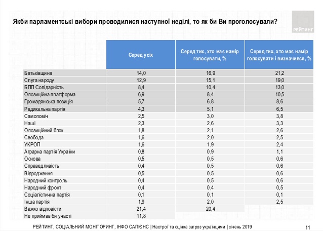 Лідером рейтингу на парламентських виборах, якби вони відбулись найближчої неділі, була б "Батьківщина", яку готові підтримати 21,2% тих виборців, які вже визначилися з вибором і мають намір голосувати. Підтримка партії "Слуга народу" складає 19,0%, БПП "Солідарність" – 13,0%, Опозиційної платформи "За життя" – 10,5%, "Громадянської позиції" – 8,6%, "Радикальної партії" – 6,5%.