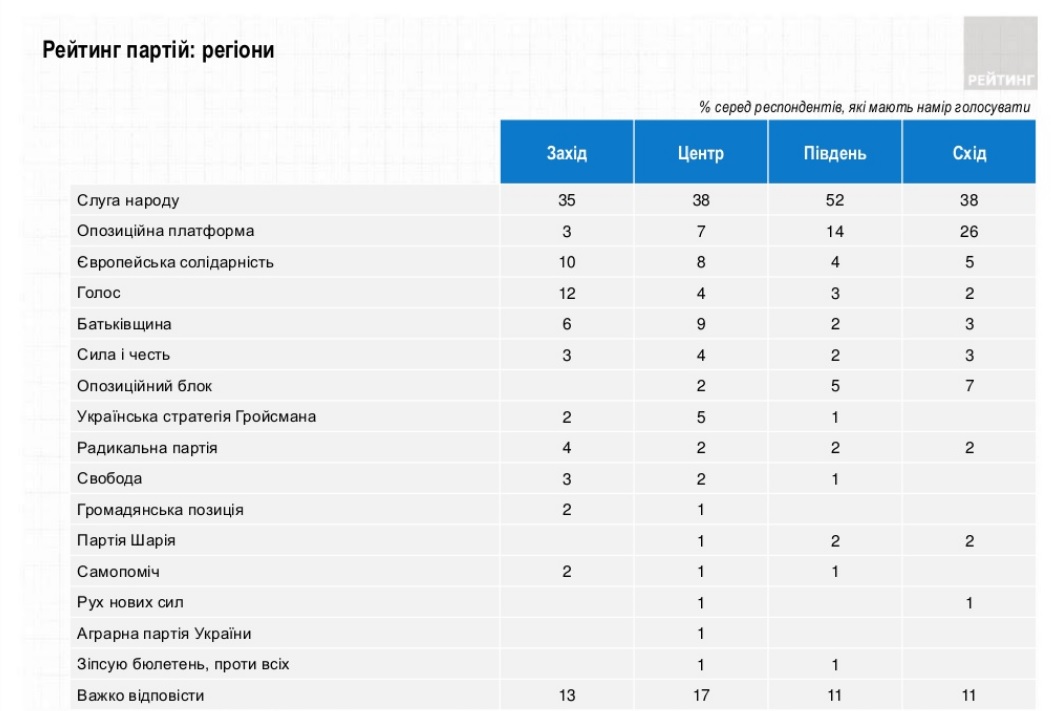 Згідно з оприлюдненими у четвер результатами, лідером електоральних симпатій серед політсил є партія "Слуга народу", яку готові підтримати 47% тих, хто має намір голосувати і визначився з симпатіями. Також на даний момент долають прохідний бар'єр партія "Опозиційна платформа - За життя" (11,6%), "Європейська солідарність" (8,2%), партія "Голос" (6,6%) та ВО "Батьківщина" (6,4%).