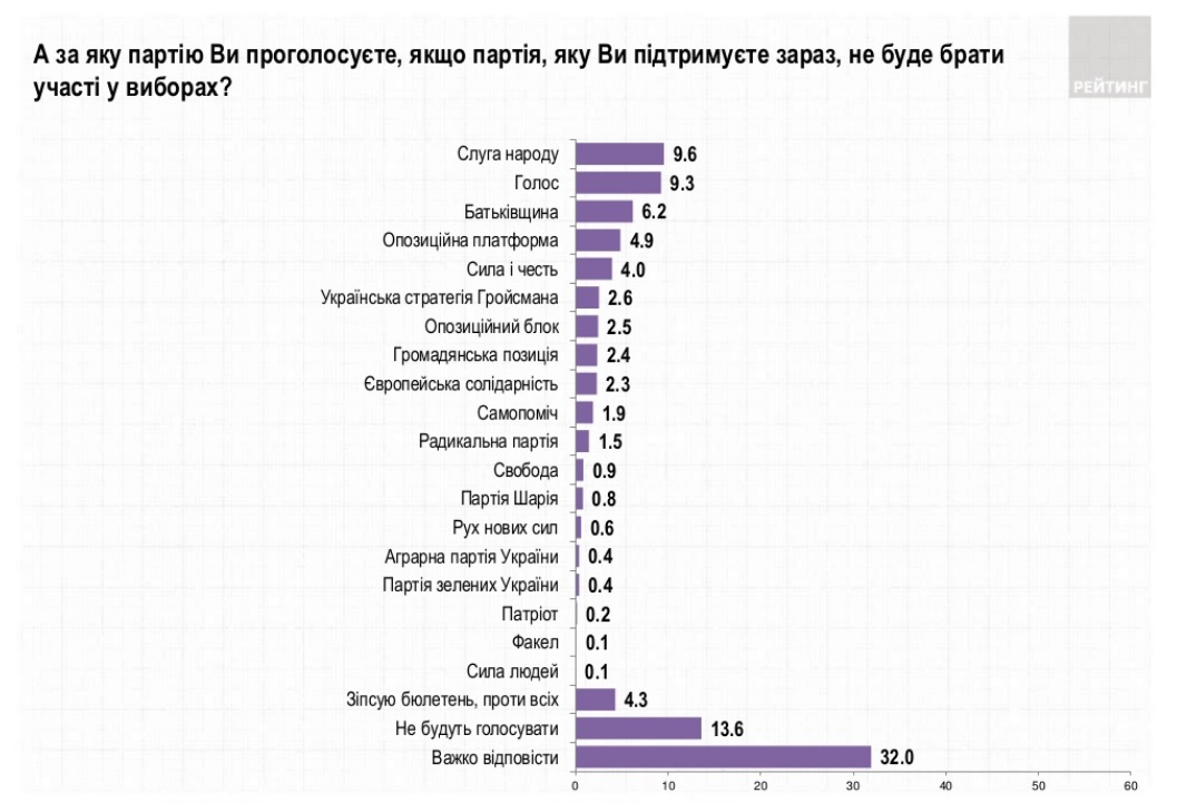 Лідерами так званого "другого вибору" є партії "Слуга народу" (9,6%) і "Голос" (9,3%). Партію "Батьківщина" як альтернативу вибору основного готові підтримати 6,2% опитаних, "Опозиційна платформу - За життя" - 4,9%, партію "Сила і честь" - 4,0%, партію "Українська стратегія Гройсмана" - 2,6%, "Опозиційний блок" - 2,5%, "Громадянську позицію" - 2,4%, партію "Європейська солідарність" - 2,3%. Інші партії - менше 2%.