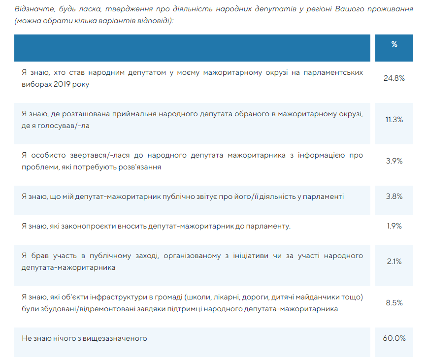Тільки 2% респондентів знають, які законопроєкти вносить депутат-мажоритарник до парламенту. Ще 8,5% респондентів відомо, які школи, лікарні, дороги та інші об’єкти збудовані чи відремонтовані завдяки підтримці народного депутата-мажоритарника. 60% респондентів заявили, що не знають нічого з вищезазначеного.