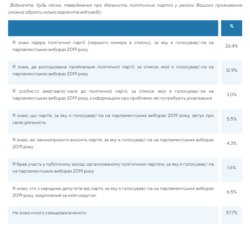 Низький рівень ознайомленості характерний і стосовно діяльності політичних партій. Лише 26,5% знають лідера політичної партії (першого номера в списку), за яку голосували на парламентських виборах 2019-го.