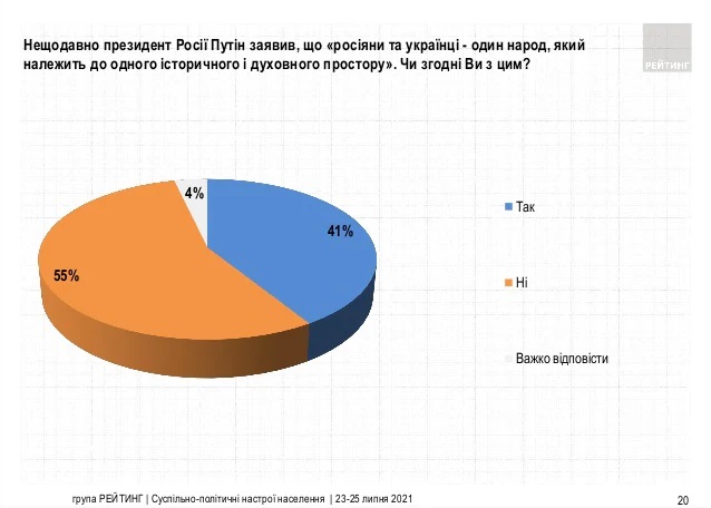 Так, 55% опитаних не погодилися із викладеною у статті Путіна заявою про те, що «росіяни та українці – один народ, який належить до одного історичного і духовного простору», 41% із цим твердженням згодні.